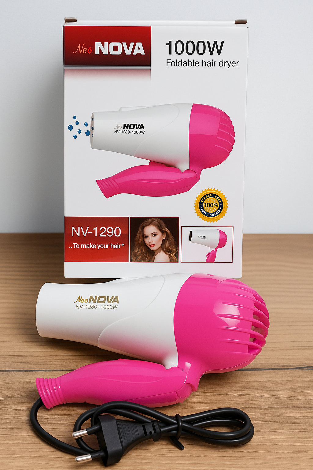 • Material: Plastic• Model Number: NV-1290• Nozzle: 1 x Nozzle• Color: White, Pink• Heat Settings: Low Heat, High Heat• Speed Settings: High/Low• Product Feature: Lightweight And Portable, Fast Drying• Power Source: Corded Electric• Package Includes: 1 x Hair Dryer• Voltage: 220 Volts• Watts: 1000 Watt• Note: Before using any new cosmetic product, perform a patch test on a small skin area. Verify ingredients for allergies and follow package warnings and directions
